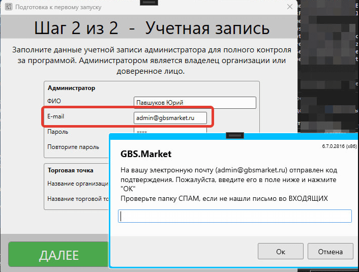 Подтверждение адреса email при первичной настройке программы