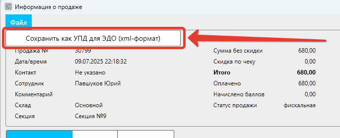 - В открывшемся окне карточки продажи открыть «Файл» – «Сохранить как УПД для ЭДО (xml-формат)»