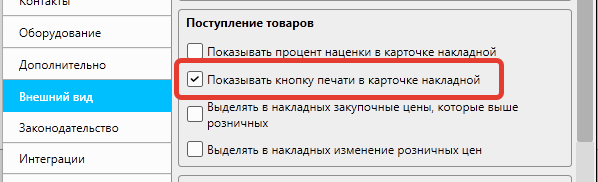 - При необходимости включите опцию «Показывать кнопку печати в карточке накладной»