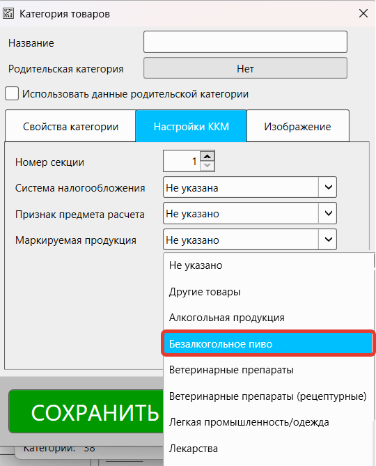 Для этого мы добавили дополнительный тип маркируемой продукции «Безалкогольное пиво», который можно выбрать в карточке категории.